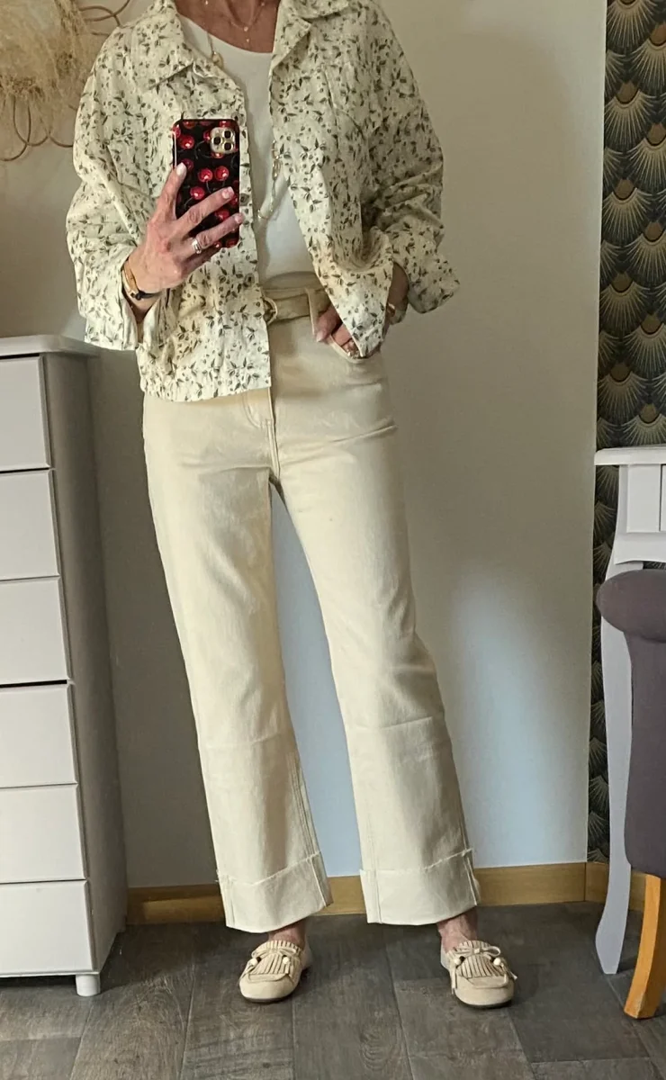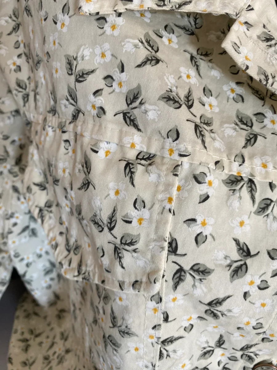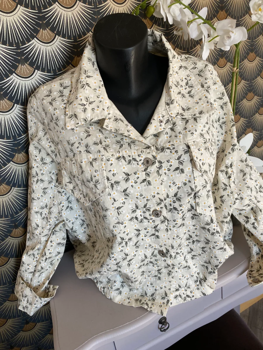 Veste à motifs floraux , deux poches avant , fermeture par boutons jeans , élastiquée dans le bas .