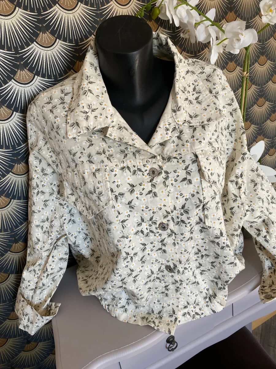 Veste à motifs floraux , deux poches avant , fermeture par boutons jeans , élastiquée dans le bas . NOUVELLE COLLECTION PRINTEMPS ETE 97% COTON ET 3% ELASTHAN LONGUEUR 52 CM LARGEUR 70 CM