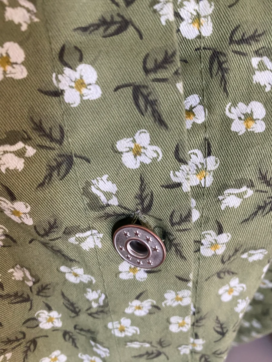Veste à motifs floraux , deux poches avant , fermeture par boutons jeans , élastiquée dans le bas .