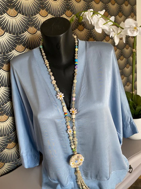 Veste gilet , fermeture par boutons , manches trois quart , col V Très agréable sur la peau , très fluide et élégante NOUVELLE COLLECTION PRINTEMPS /ETE 2025 Composition: 80% VISCOSE ET 20% SOIE MADE IN ITALIE Longueur : 60cm largeur : 60 cm