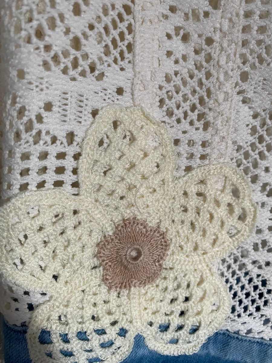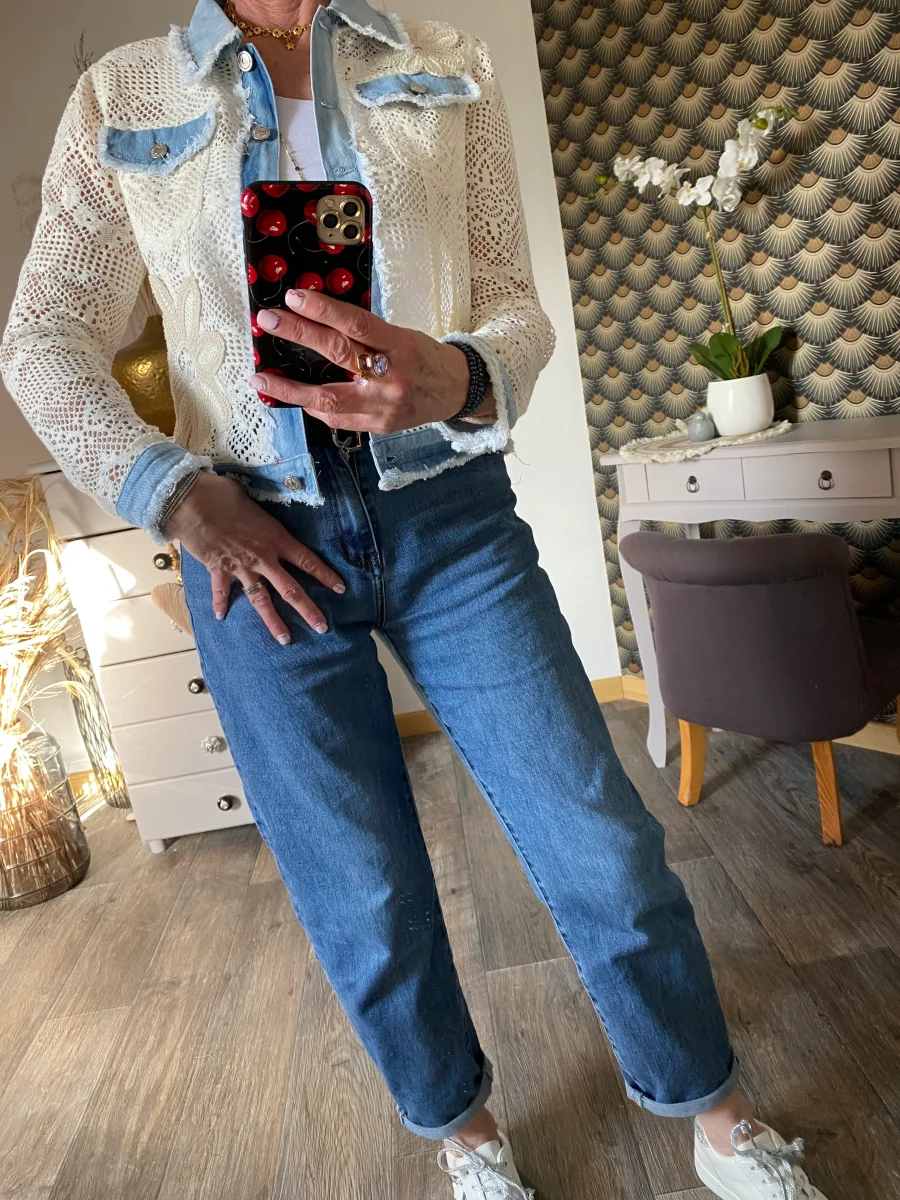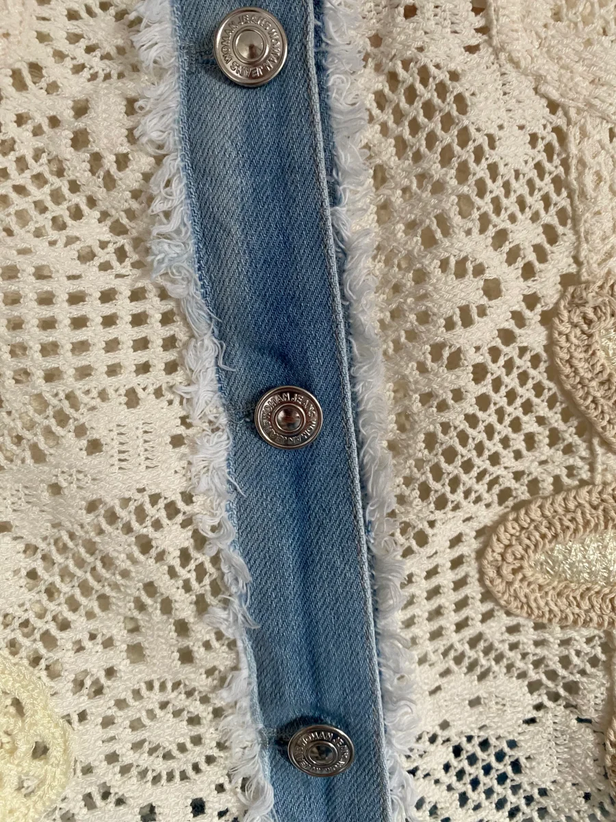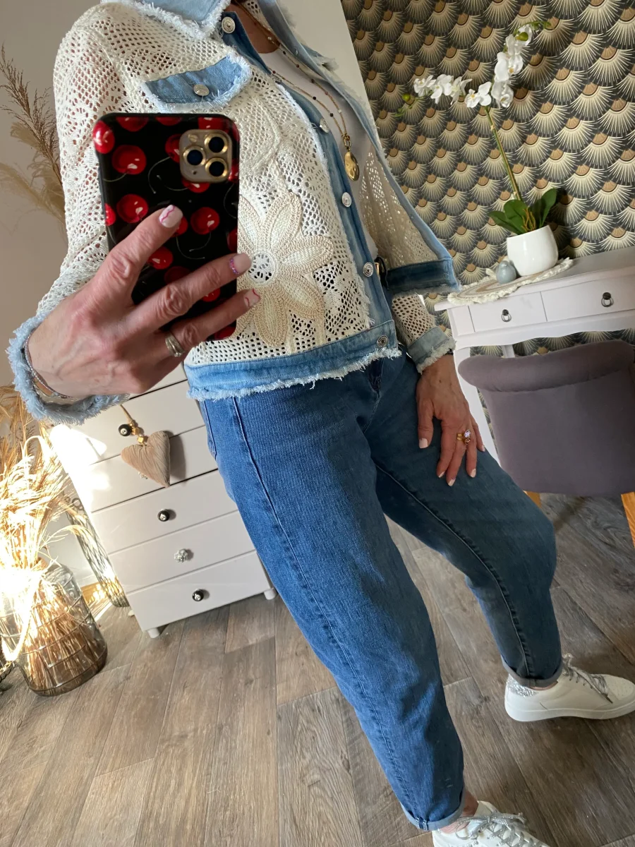 Veste en broderies et jeans , fermeture par boutons , deux poches sur le devant