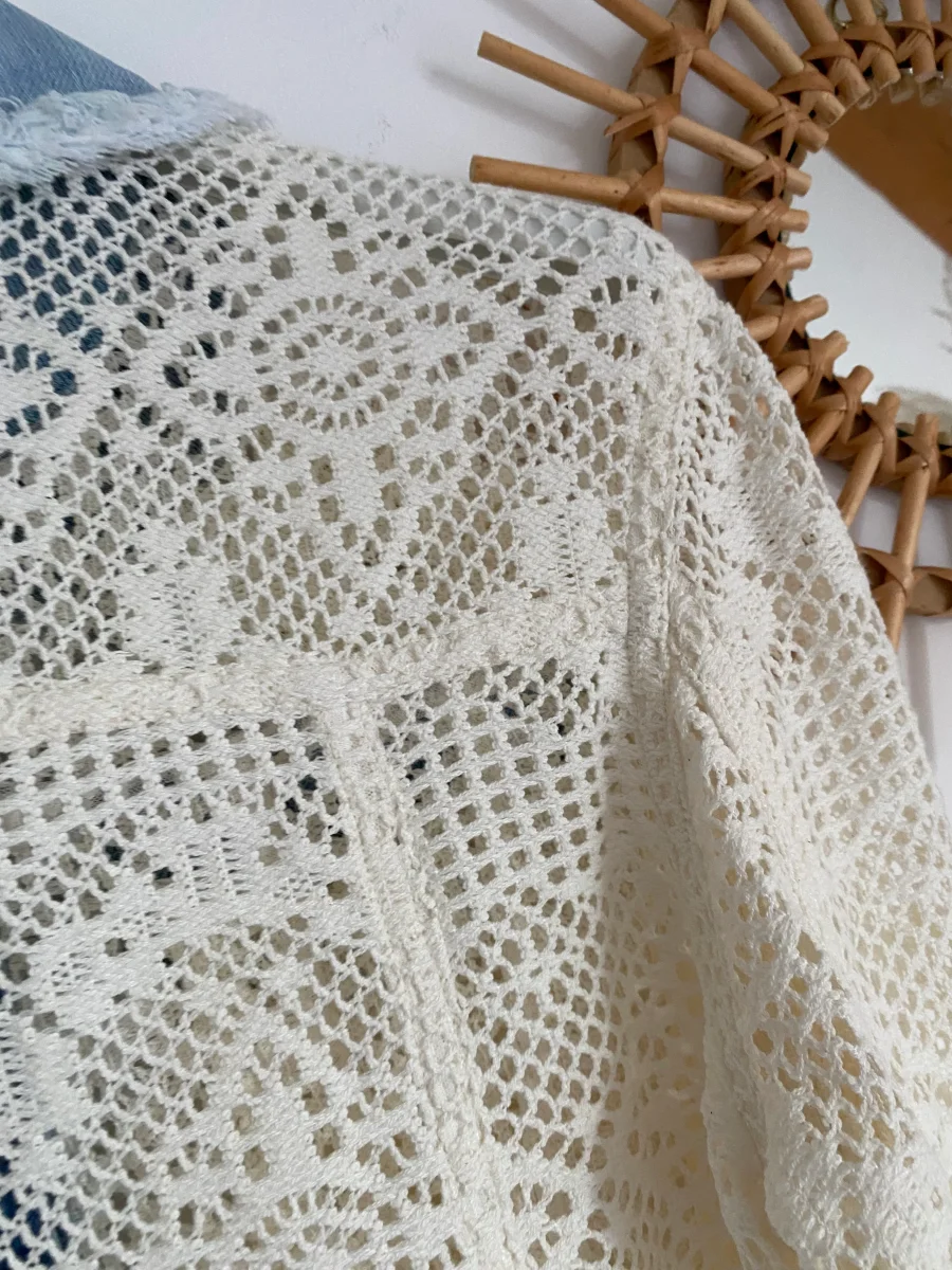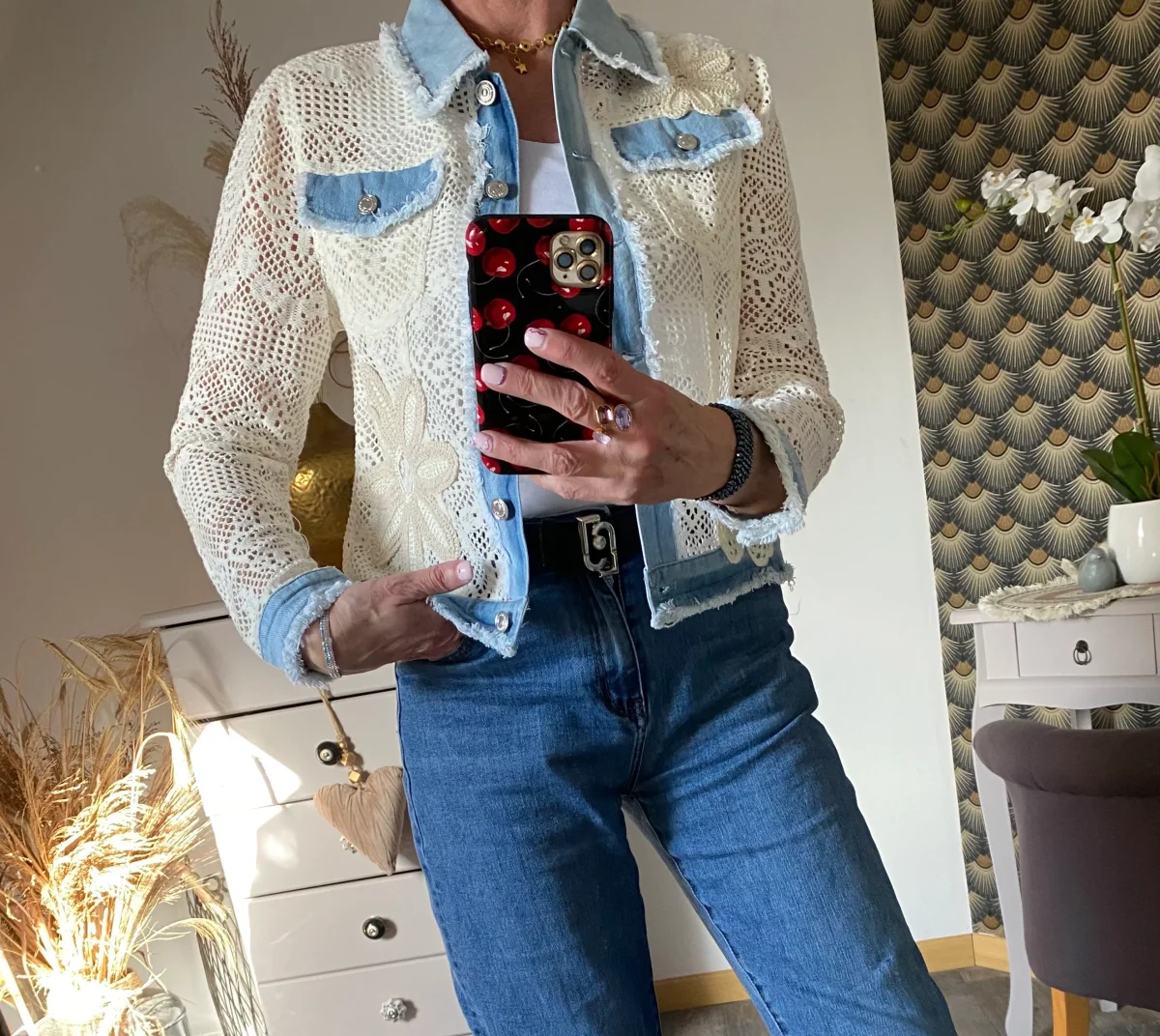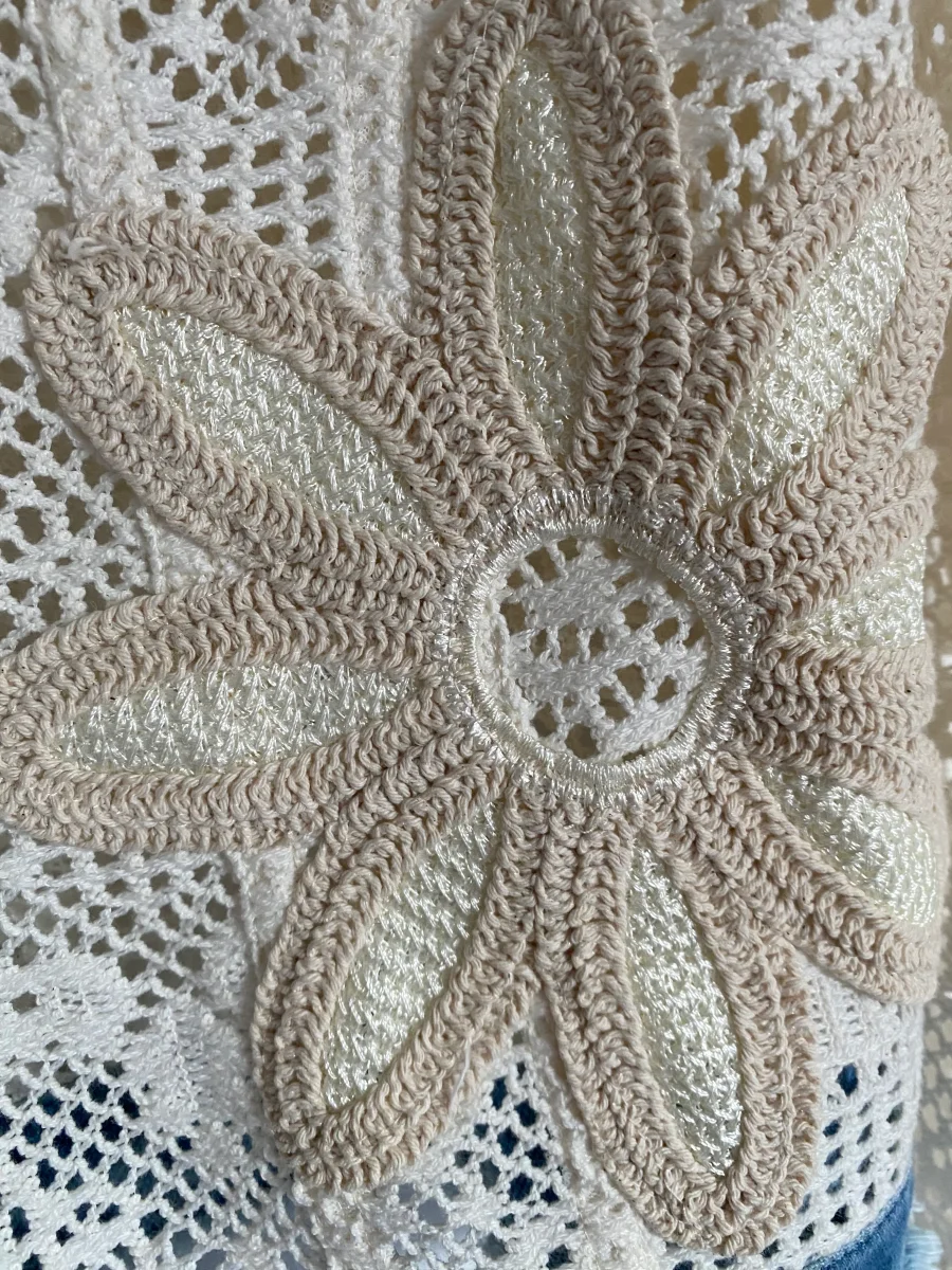 Veste en broderies et jeans , fermeture par boutons , deux poches sur le devant