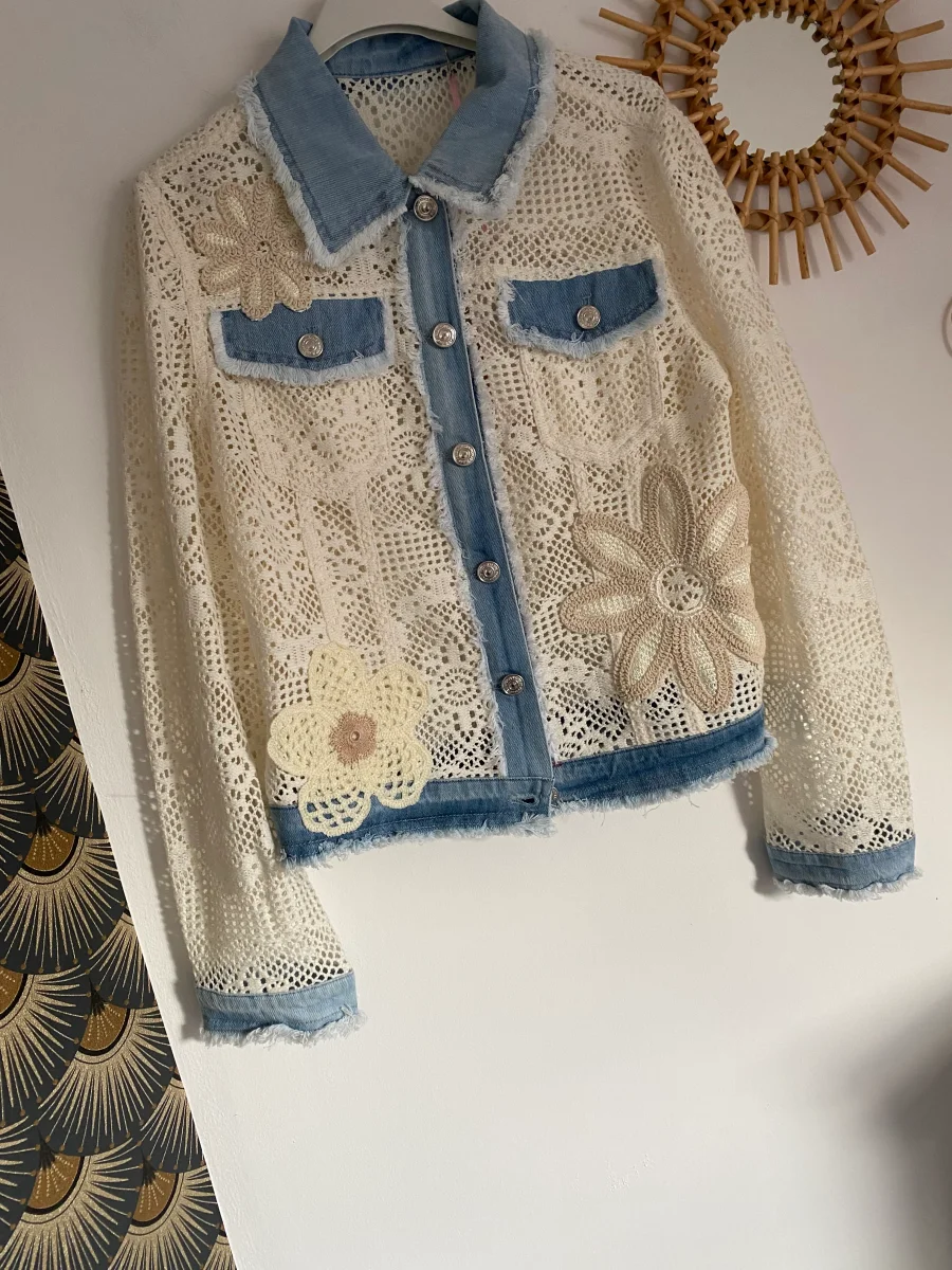 Veste en broderies et jeans , fermeture par boutons , deux poches sur le devant NOUVELLE COLLECTION PRINTEMPS 2026 95% COTON 5% POLYESTERE S/M : LONGUEUR 51 CM LARGEUR 50 CM M/L LONGUEUR 52 CM LARGEUR 53 CM L/XL LONGUEUR 54 CM LARGEUR 55 CM