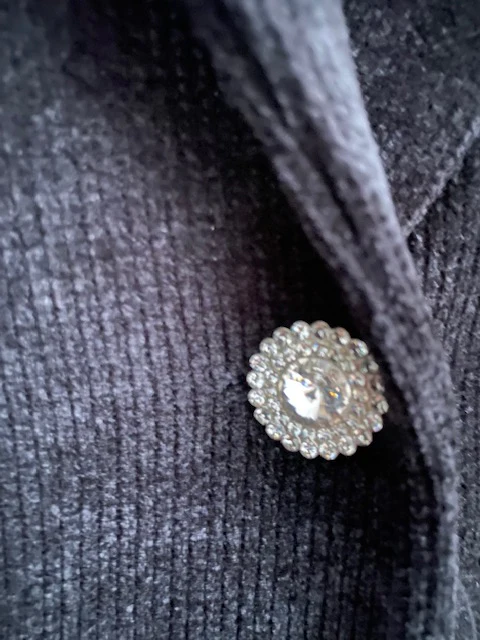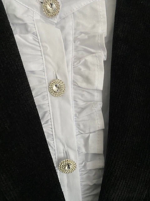 Veste en velour, manches longues , coupe blazer, deux fausses poches, fermeture par un boutons fantaisies avec strass , fausse chemise jabot intégrée à la veste , peut se porter ouverte .