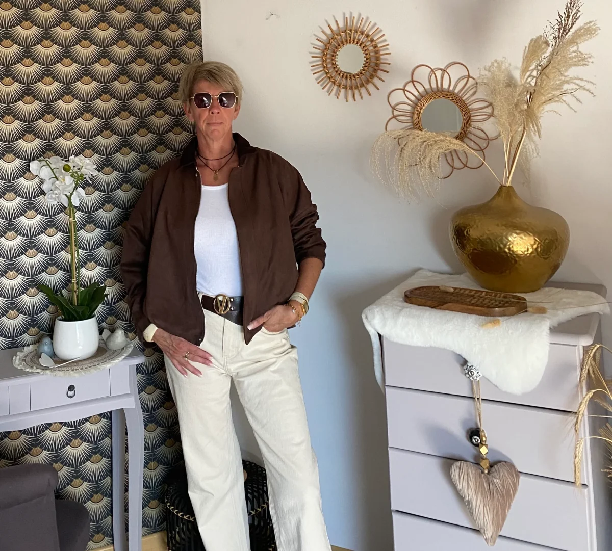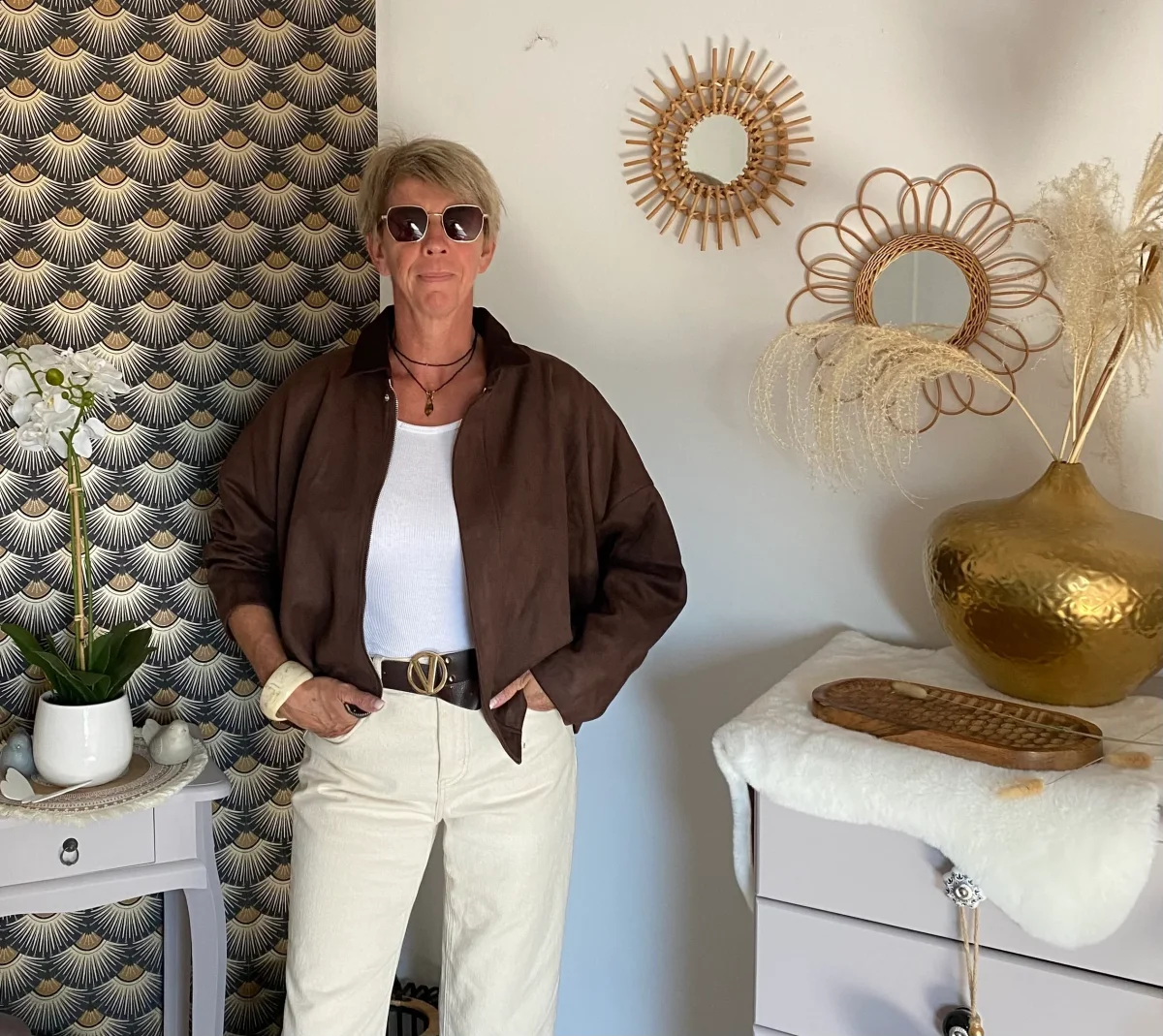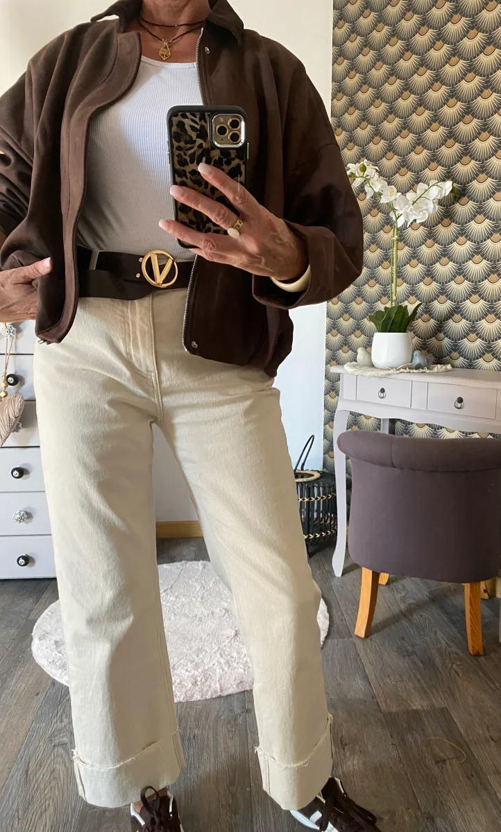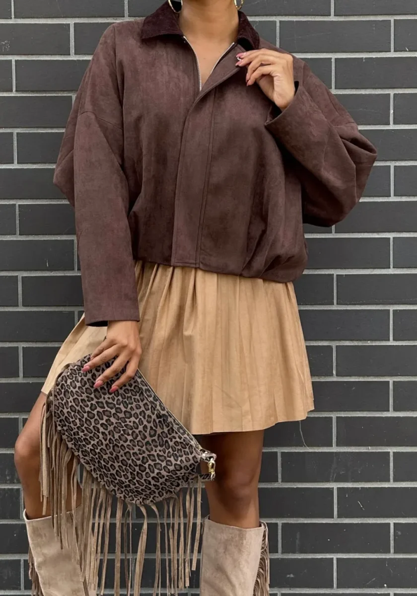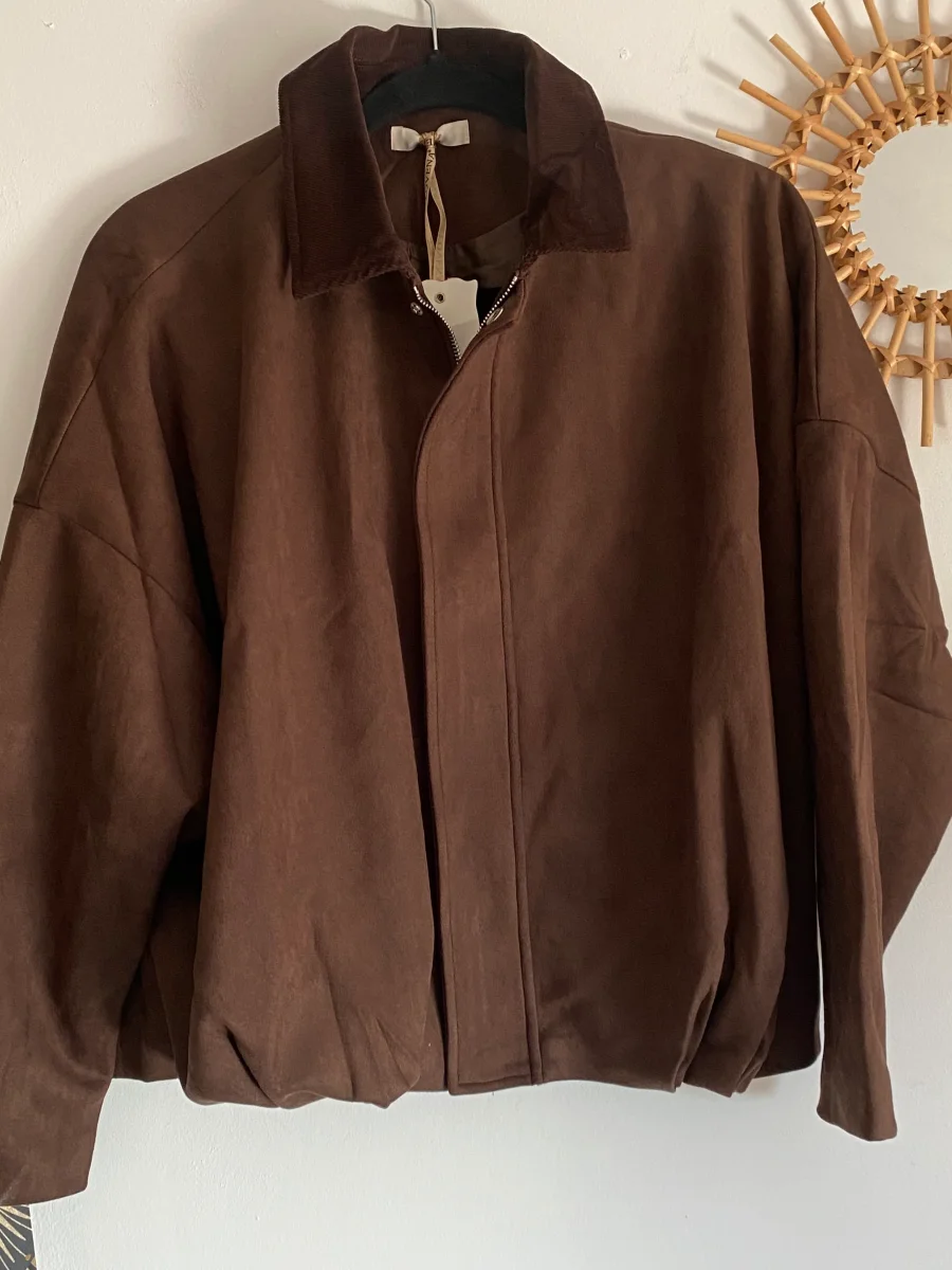 Veste doublée aviateur en suédine , manches chauve souris , fermeture par zip et pressions , col velour chocolat foncé. NOUVELLE COLLECTION AUTOMNE HIVERS 2025 90% POLYESTERE 10% ELASTHAN Longueur: 57 cm largeur: 80 cm